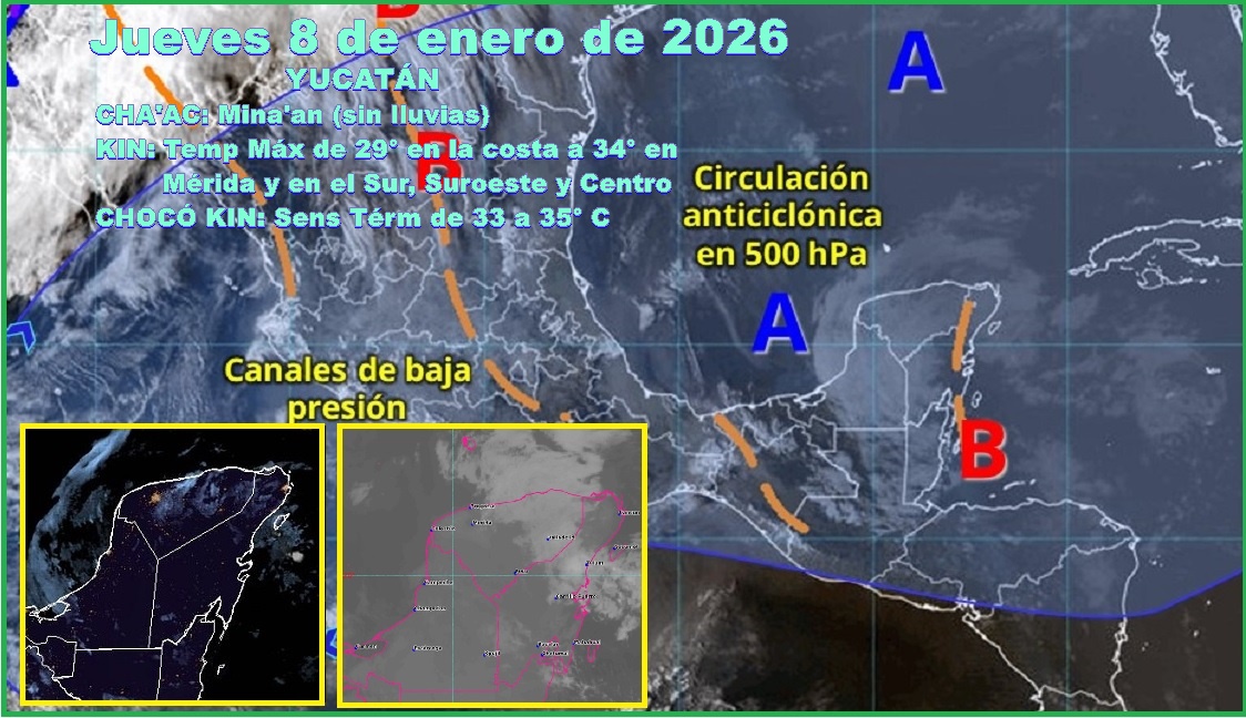 MÉRIDA, Yucatán jueves 08/01/26.– Cha’ac sigue fuera de Yucatán y hoy jueves tampoco habrá lluvias, en tanto que las temperaturas máximas serán de 28º en la costa a 31º C en buena parte de la tierra de Armando Manzanero.
