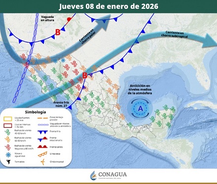 CAMPECHE Y QUINTANA ROO: Se pronostica cielo de medio nublado a nublado durante el día y habría chubascos en Quintana Roo, así como lluvias aisladas en Campeche. Bancos de niebla y fresco en la mañana, en tanto que en la tarde el ambiente será de cálido a caluroso y el viento soplará del Este, de 10 a 20 km/h y rachas de 30 a 50 km/h.