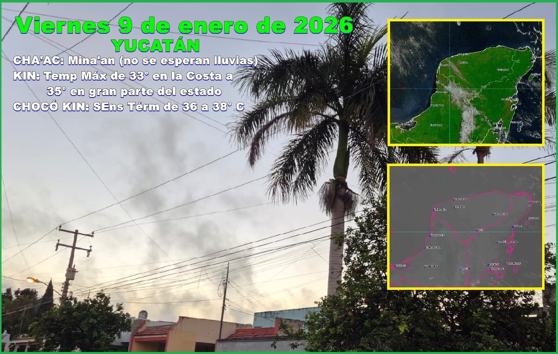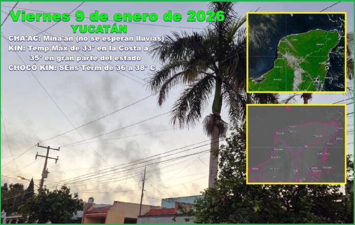 MÉRIDA, Yucatán viernes 09/01/26.– Cha’ac sigue fuera de gran parte de Yucatán y hoy viernes tampoco habrá lluvias, en tanto que las temperaturas máximas serán de 33º en la costa, Oriente y en el Sur, a 35º C en buena parte de la tierra de Armando Manzanero.