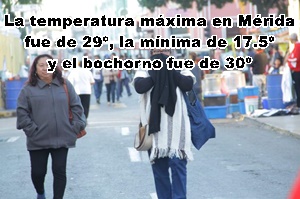 MÉRIDA: Máxima, 29º C, Oriente; mínima 17.5º, Norte; bochorno, 30º