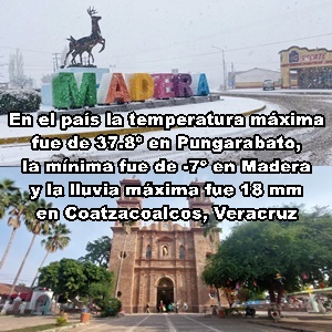 En el país, la temperatura máxima fue de 37.8º, en Pungarabato, mientras que la mínima fue de -7º en Madera. La lluvia máxima de la patria apenas alcanzó los 18 milímetros.