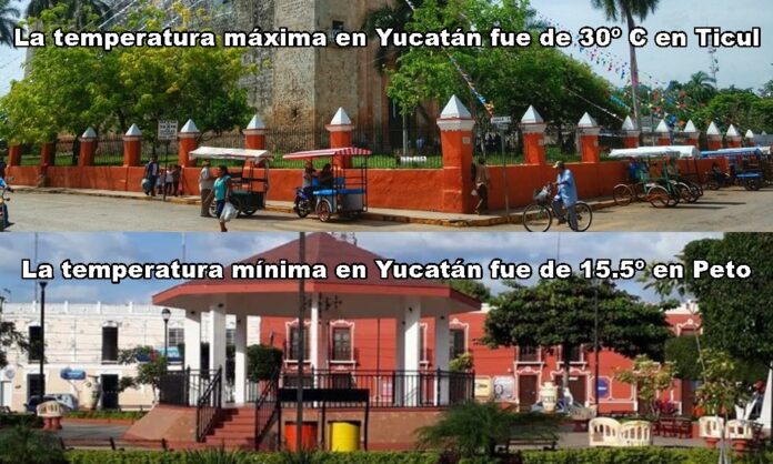 MÉRIDA, Yucatán, miércoles 14/01/26.- Ayer martes, la temperatura máxima de Yucatán fue de 30º C en Ticul, al Sur yucateco, en tanto que la mínima fue de 15.5º, en Peto, también del Sur del estado, en un día en el que cha’ac no llegó y no hubo lluvias.