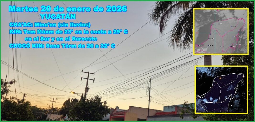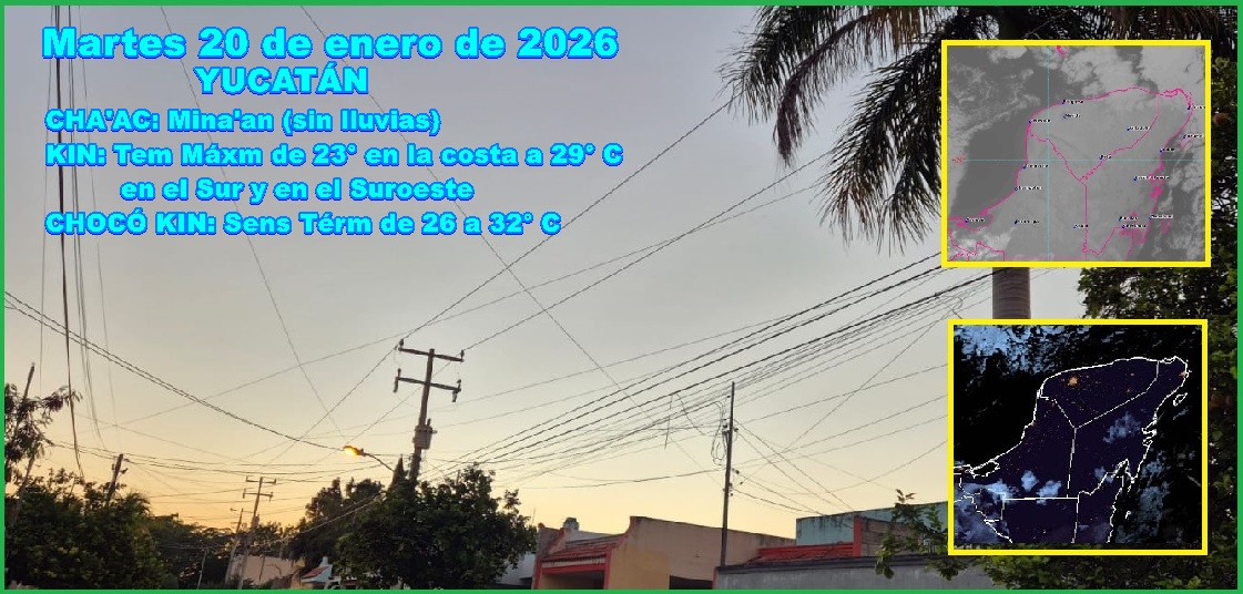 MÉRIDA, Yucatán, martes 20/01/26.- Luego de un amanecer muy frío, debido a la masa de aire frío que impulsó al frente frío 29, el décimo que afectó a Yucatán, se esperan temperaturas máximas de 24 a 29º C y sensación térmica de 29 a 32º C.