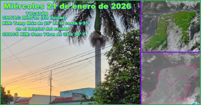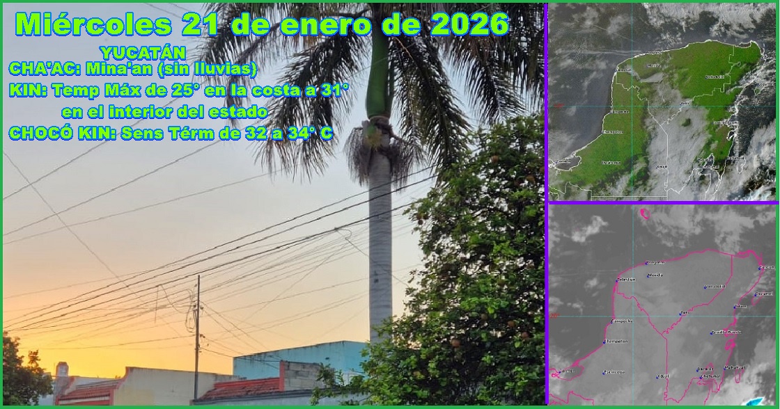 MÉRIDA, Yucatán, martes 20/01/26.- Luego de un amanecer de frío a muy frío, hoy miércoles se espera, debido a los efectos de los remanentes de la masa de aire frío del frente frío 29, ambiente algo caluroso a caluroso, cielo medio nublado y vientos del este y noreste.
