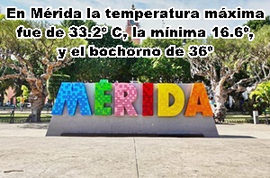 MÉRIDA: Máxima, 33.2º C, Nororiente; mínima 16.6º, Oriente; bochorno, 36º