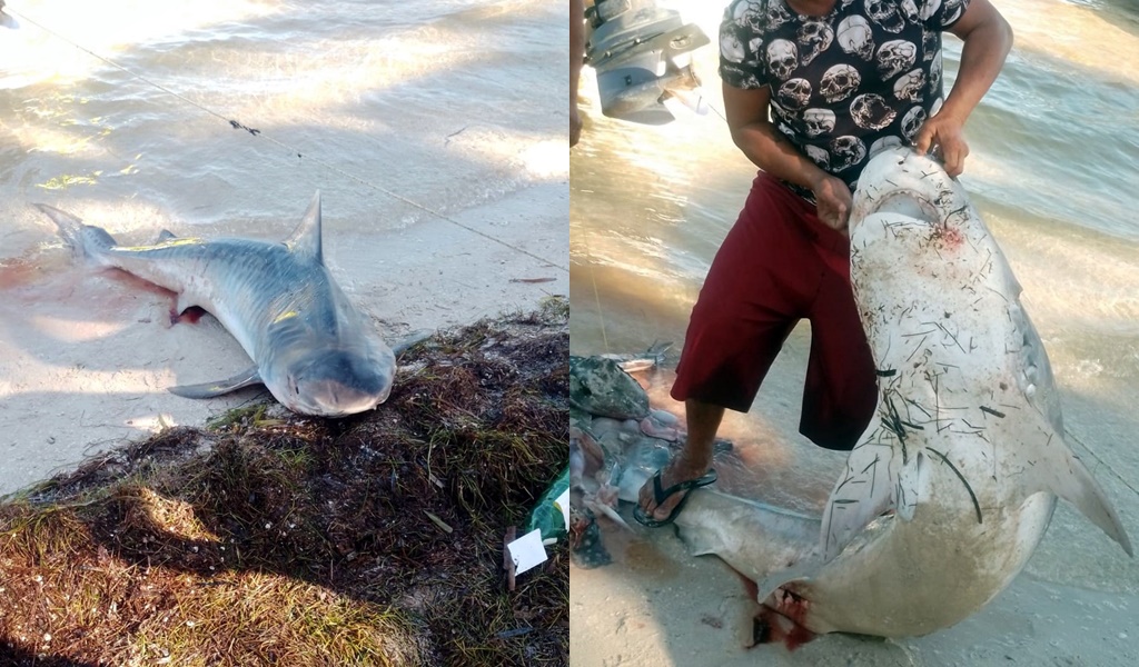 DZIDZANTÚN, Yucatán, viernes 23/01/26.- Pescadores del puerto de Santa Clara se llevaron la grata sorpresa que un tiburón tintorera de casi dos metros de largo quedó “amalladó” en su red.