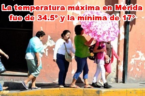 MÉRIDA: Máxima, 34.5º C, Poniente; mínima 17º, Norte