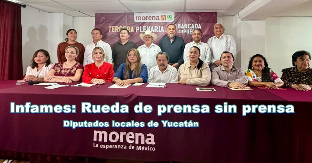 Es inédito en Yucatán este montaje de rueda de prensa. Al parecer no invitaron ni siquiera a los medios alineados a Morena. Los diputados guindas hicieron la faramalla de la rueda de prensa, pero únicamente le hablaron a la cámara del teléfono con el que transmitió el comité estatal de Morena.