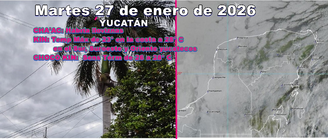 MÉRIDA: Para la capital de la tierra del pib, del brazo de reina y de los codzitos se pronostica una temperatura máxima de 24 a 26º C, bochorno de 26 a 28º y baja probabilidad de lluvias.