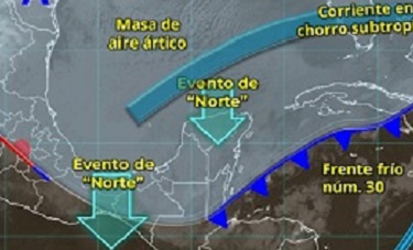 CAMPECHE: Se espera cielo de medio nublado a nublado, hay probabilidad de chubascos en el sur estado y lloviznas aisladas en el centro y sur. Ambiente cálido en la tarde, con viento del norte-noreste, de 15 a 30 km/h y rachas mayores a 40 km/h en la Sonda de Campeche, debido a la masa de aire frío que impulsó al frente frío 30, que cubrirá la Península de Yucatán.