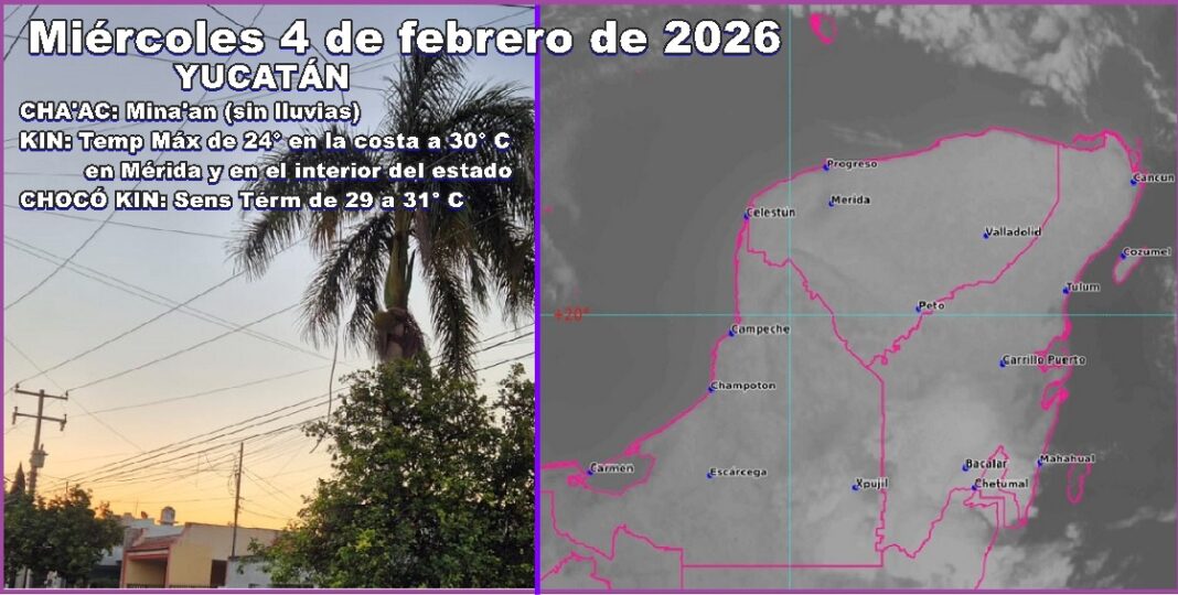 MÉRIDA, Yucatán, miércoles 04/02/26.– Hoy miércoles, habrá una mínima tregua al frío del día, pues se esperan máximas de hasta 30º C, en gran parte del estado, con bochorno de 31º.