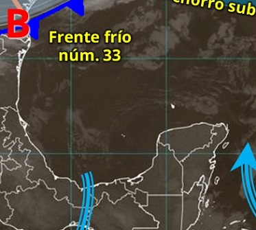 El frente frío 33 entró al Noroeste del Golfo de México y lo recorrerá muy rápido durante el día: Llegará a la costa Norte de la Península poco después del mediodía del jueves.