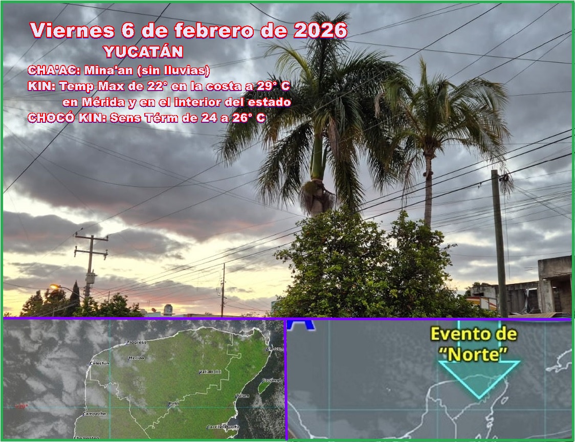 MÉRIDA, Yucatán, viernes o6/02/26.– El “Norte” del frente frío 33, décimo segundo que nos afecta, de la temporada 2025-2026 y séptimo del año, bajará el mercurio a 22º en la Costa, 24º en Mérida y la temperatura máxima llegaría a 26º, con sensación térmica de 26º C.