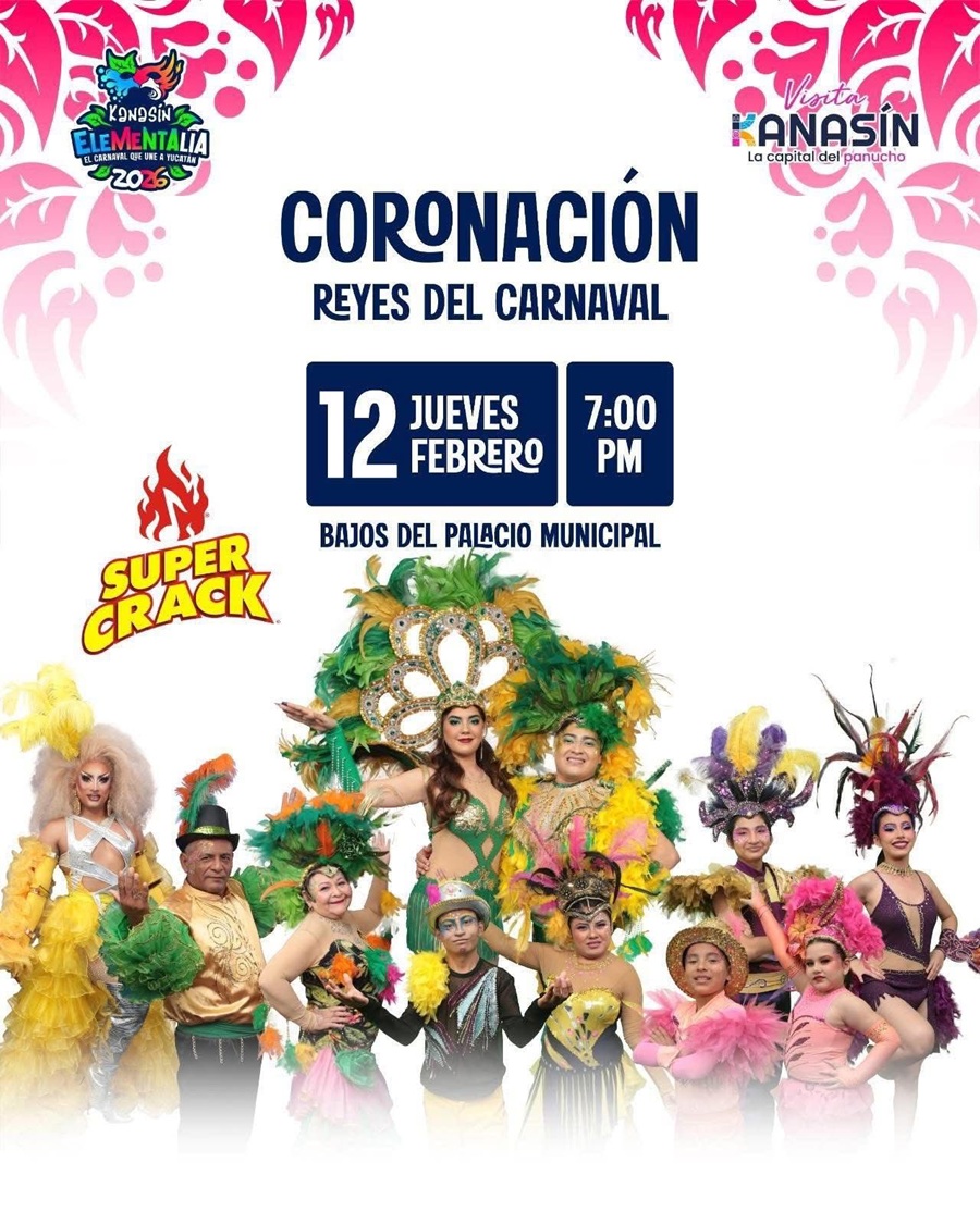El jueves 12 de febrero serán coronados los reyes del Carnaval de Kanasín 2026 en sus diferentes categorías: los Reyes Oficiales: Nicte Ha I y Amauri I; Los Reyes Juveniles: Sofía I y Ángel I; los Reyes Infantiles: Scarlett I y Rubén I; los Reyes de la Discapacidad: Kelly I y Lalito I; los Reyes de los Adultos Mayores: Teresa I y Ramón I; y, la Soberana de la Comunidad LGBT+: Dakota Drag I. Evento se llevará al cabo a partir de las 7 de la tarde en los bajos del Palacio Municipal de Kanasín.