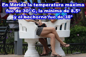 MÉRIDA: Máxima, 30º C, Oriente/Poniente; mínima 8.5º, Norte; bochorno, 30º