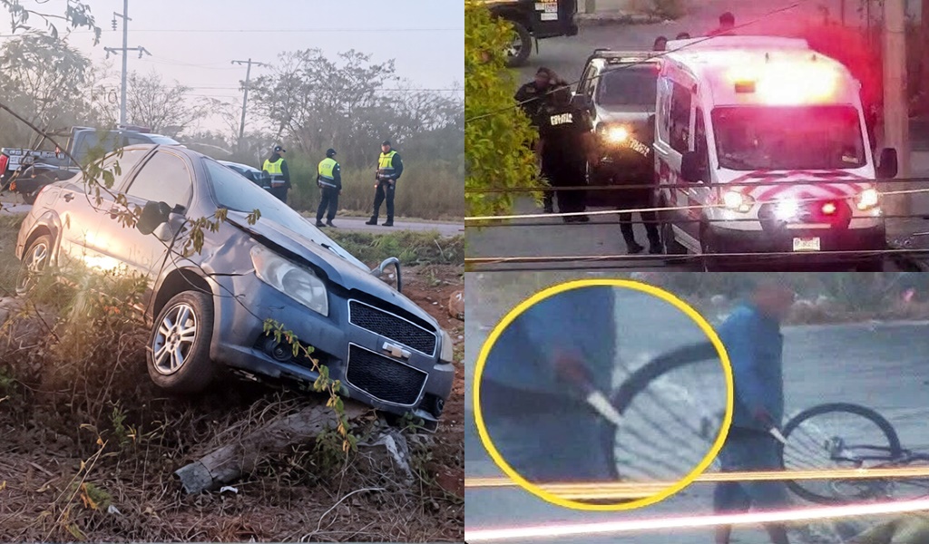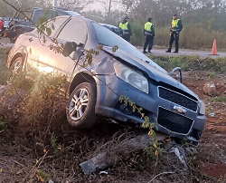 Una aparatosa salida de camino ocurrió el lunes en la mañana, en el kilómetro 65 de la carretera Mérida-Tizimín, tramo Temax-Cansahcab, donde una joven conductora a bordo de un Chevrolet Aveo perdió el control del volante.