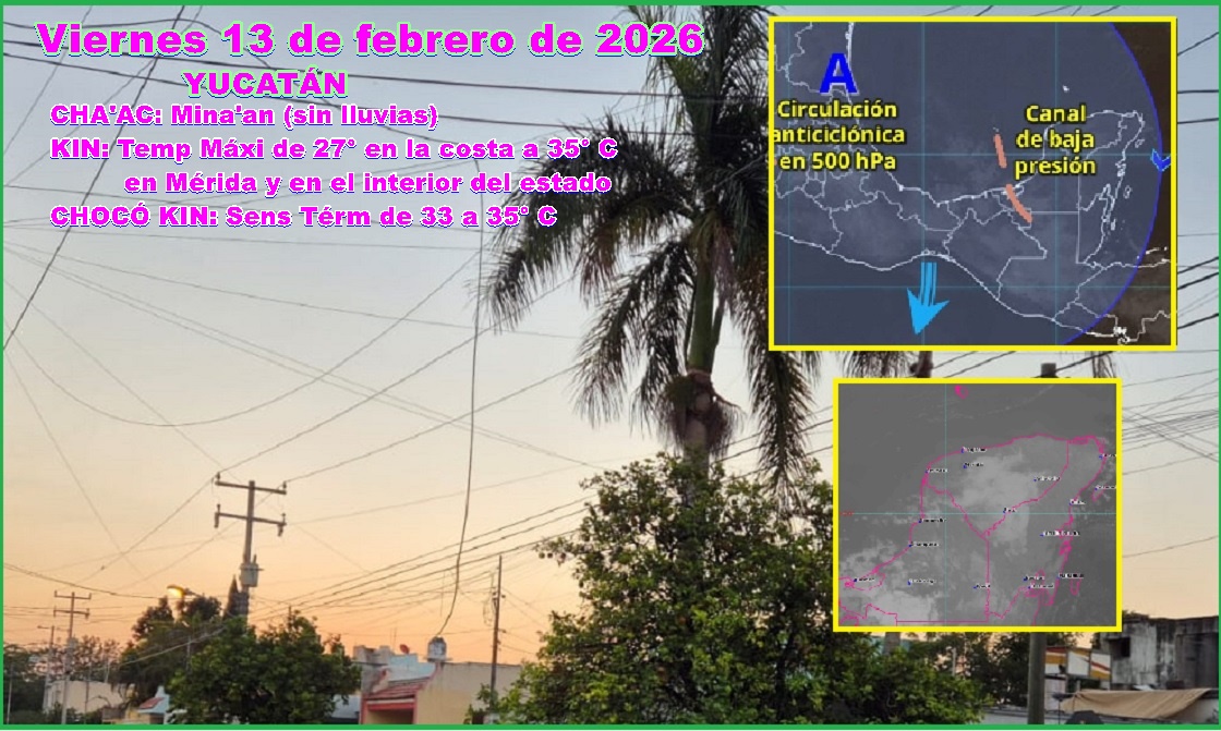 MÉRIDA, Yucatán, viernes 13/02/26.– Para hoy viernes, luego de un amanecer fresco y con niebla y/o neblina en algunas partes, se esperan temperaturas máximas DOS grados más altas que ayer jueves, es decir de hasta 35º C, con bochorno de 37º C.