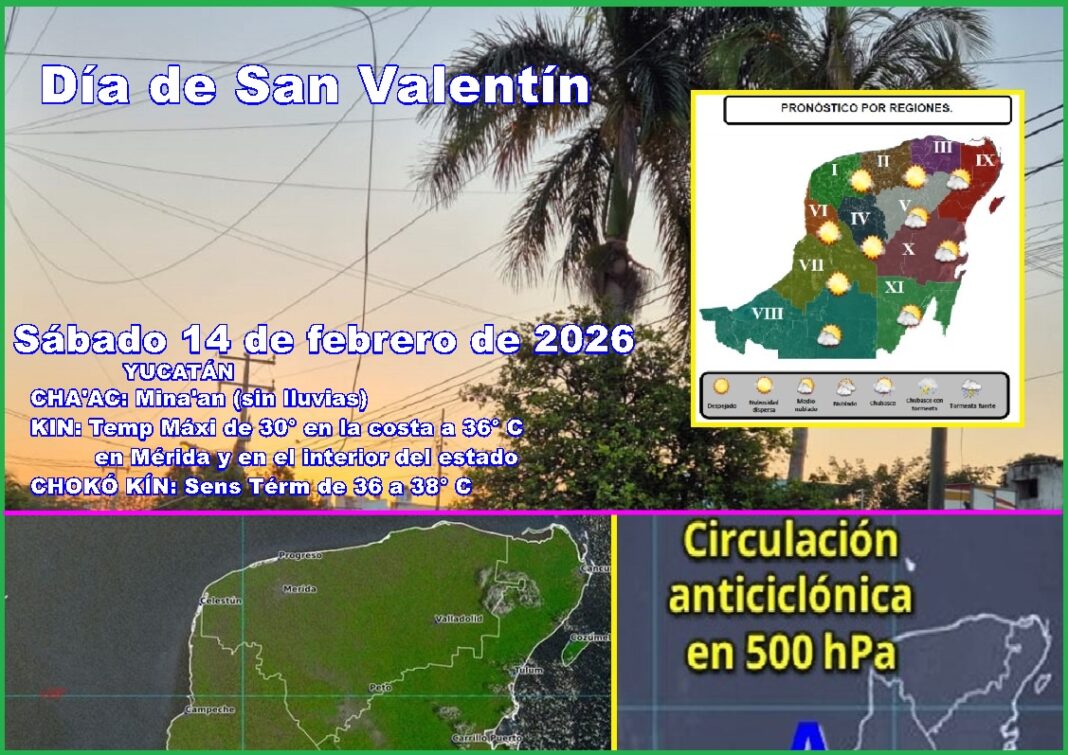 MÉRIDA, Yucatán, sábado 14/02/26.- Hoy sábado, Día de San Valentín, luego de un amanecer de templado a cálido se espera calor, que llegaría a 34º C, en la mitad de los 20 municipios más grandes de Yucatán.