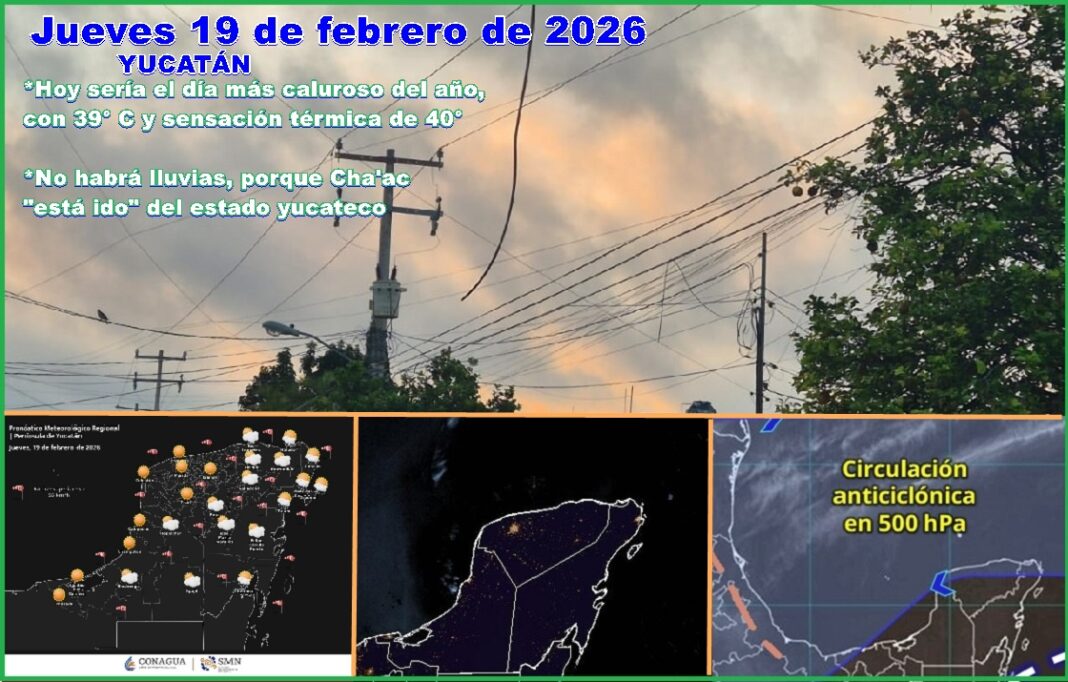 MÉRIDA, Yucatán, jueves 19/02/26.– Hoy, jueves de cuaresma, la temperatura máxima rondará los 40º C, luego de los 37.5º del lunes y martes, mientras que el bochorno llegaría a 40º C, sin lluvias en el estado.