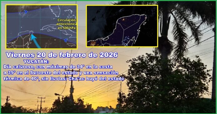 MÉRIDA, Yucatán, viernes 20/02/26.– Hoy viernes, en Yucatán se esperan temperaturas máximas de 34º en la costa y en el Oriente del estado, a 39º C, en el Suroeste yucateco, sensación térmica de 40º y sin lluvias.