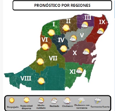QUINTANA ROO: Se espera de cielo despejado a parcialmente nublado, probabilidad (muy baja) de lloviznas aisladas en la costa del estado, ambiente caluroso a muy caluroso durante el día y cálido por la noche y los vientos soplarán del Sureste de 20 a 30 km/h, con rachas mayores a 50 km/h.