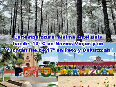 MÍNIMAS: Yucatán, 17º, en Peto, Oxkutzcab y Becanchén (Tekax); México, -10 Navíos Viejos, Durango