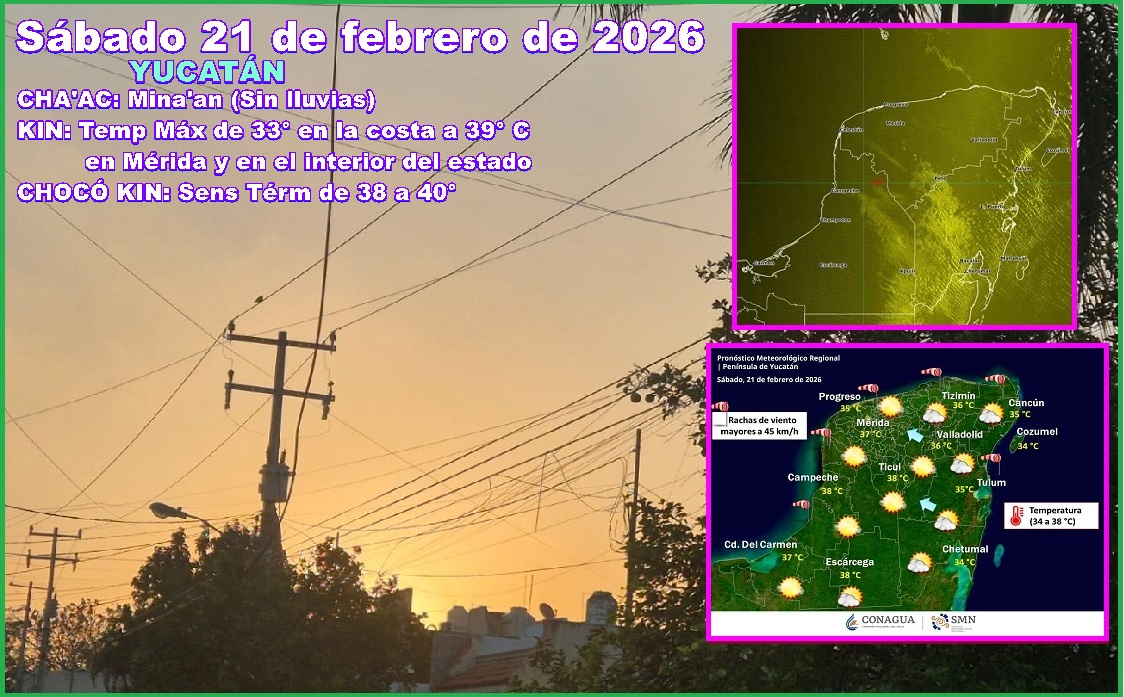 MÉRIDA, Yucatán, sábado 21/02/26.- Hoy sábado, luego de un amanecer de templado a cálido se espera calor, que llegaría a 39º C en el Sur, Suroeste y Centro del estado, con una sensación térmica de 40º C.