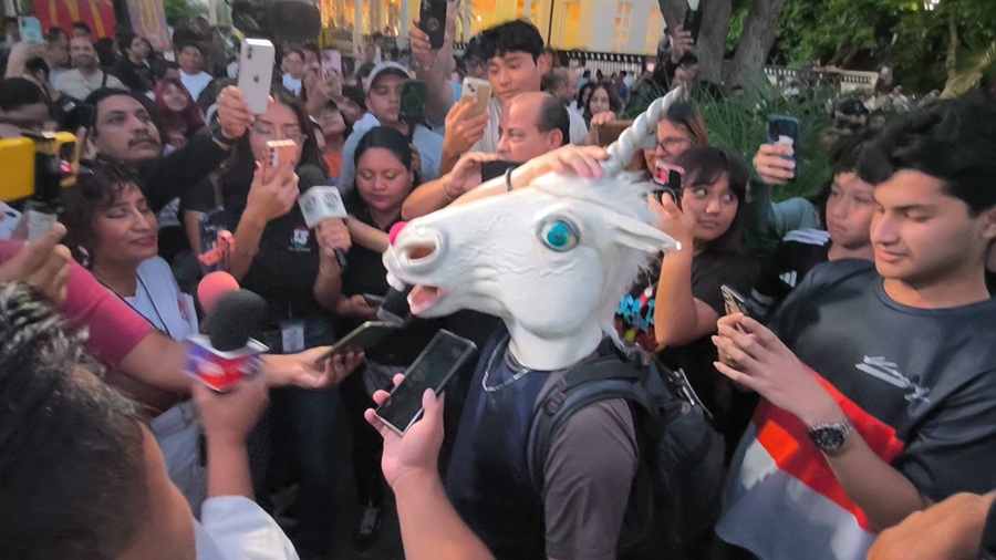 Después de un gran rato llegó un sujeto con una gran cabeza de unicornio, pero con ropa muy humana, incluso con una mochila. Enseguida la nube de reporteros y curiosos se le fue encima para entrevistarlo, pero no dijo nada nuevo más allá de lo que se haya dicho en redes sociales sobre esta moda.