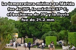 MÉRIDA: Máxima, 37º C, Oriente; mínima 20º, Norte; bochorno, 39º; 21.2 mm acumulados