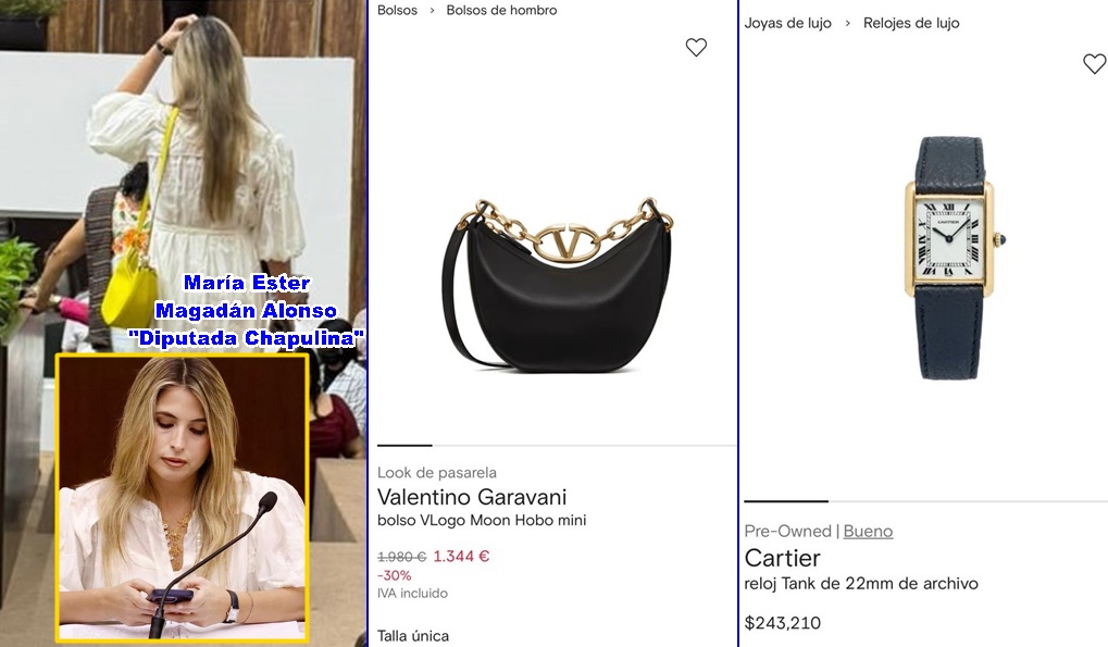 LAS PRENDAS: El jueves anterior la “Diputada Chapulina”, antes Chelita Magadán, llevó un reloj Cartier Tank, que vale $243,210 y un bolso de mano de la marca Valentino Garavani, modelo VLogo Moon Hobo Mini, de $27,363.