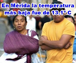 De acuerdo con el IC Juan Vázquez Montalvo, en esta ciudad, la temperatura más baja fue de 13.1º C, en el Norte y en el Poniente, en tanto que en la costa la mínima fue de 14.6º en Celestún y la mínima más alta de 15.9º C en Las Coloradas, comisaría de Río Lagartos.