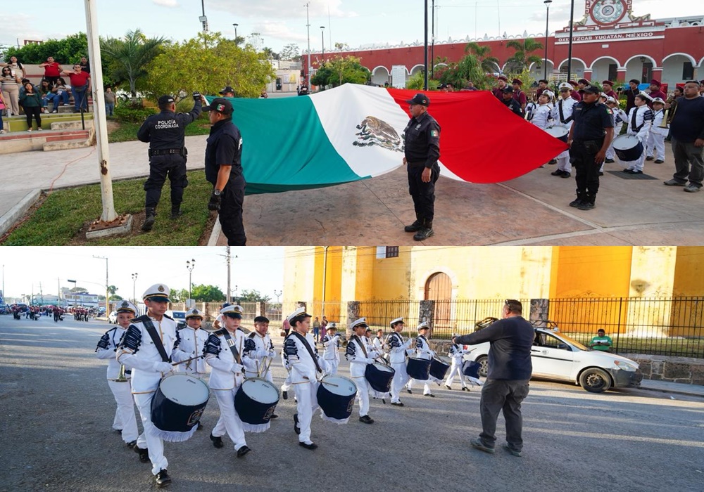 OXKUTZCAB, Yucatán, miércoles 25/02/26.- En el marco del Día de la Bandera, el Ayuntamiento, encabezado por el alcalde Juan José Martín Fragoso, organizó una demostración y desfile de escoltas y bandas de guerra por las principales calles de la ciudad.