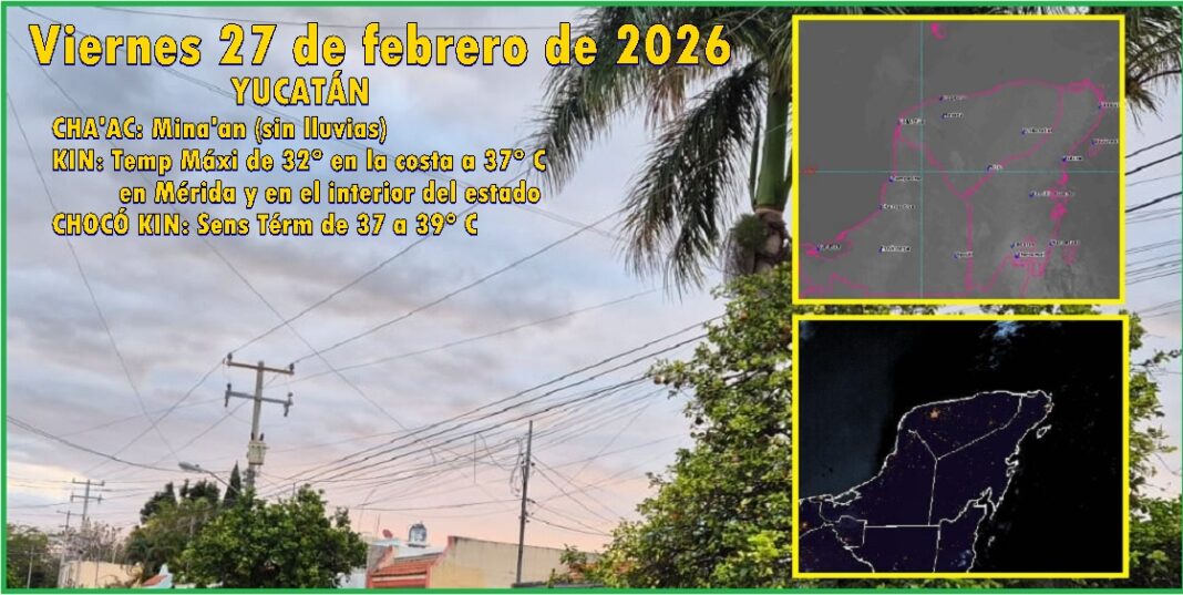 MÉRIDA, Yucatán, viernes 27/02/26.– Hoy, el último viernes del mes y el penúltimo día de febrero, luego de un amanecer de algo fresco a fresco, en Yucatán subirá más la sensación térmica que llegará a 39º C, sin lluvias.