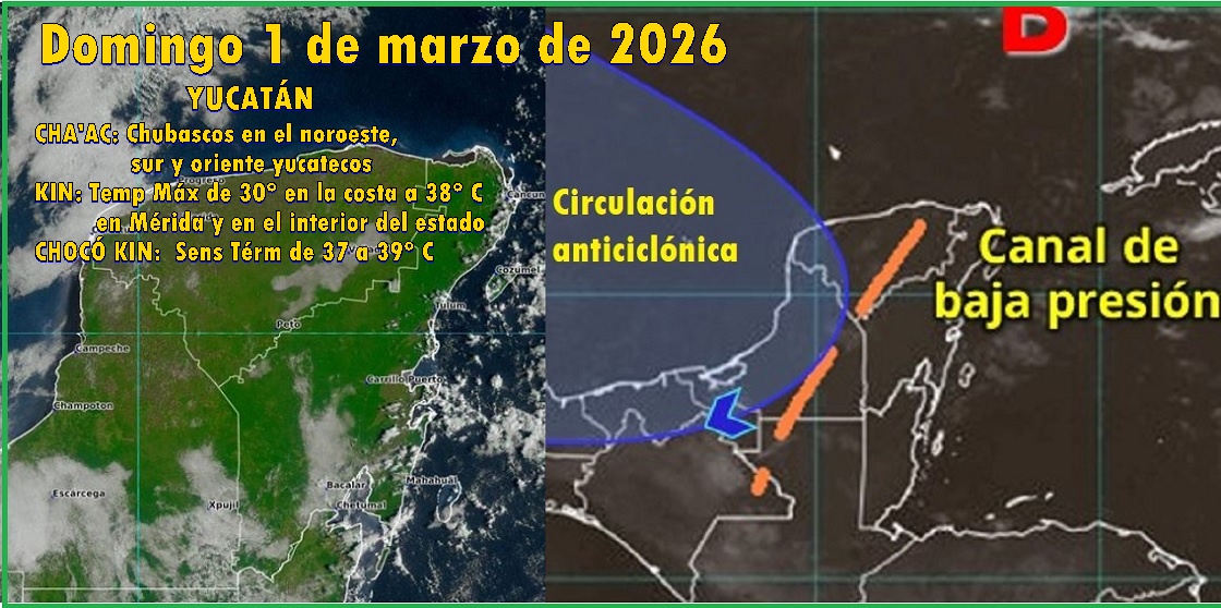 MÉRIDA, Yucatán, domingo 01/03/25.- Hoy domingo, primer día del tercer mes del año, la temperatura máxima en el estado será de 30º en la costa a 38º C en el Sur yucateco, con bochorno de 39º y habría chubascos en el noroeste, sur y oriente de Yucatán.