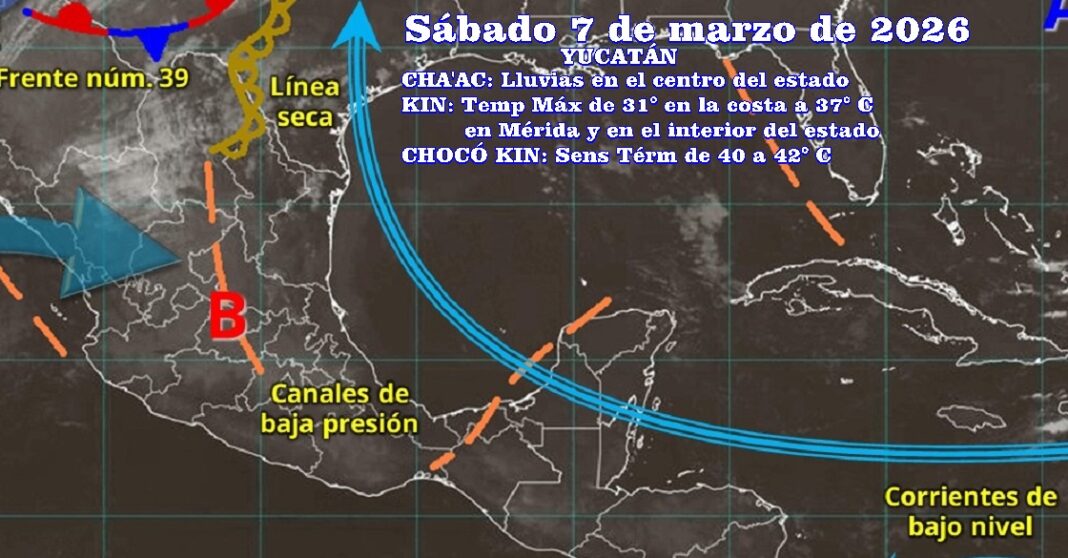 MÉRIDA, Yucatán, sábado 07/03/26.- Hoy, en la tierra del faisán y del venado, debido a una vaguada sobre la Península de Yucatán y la llegada de humedad se esperan lluvias vespertinas y/o nocturnas y elevada sensación de térmica, de hasta 42º.
