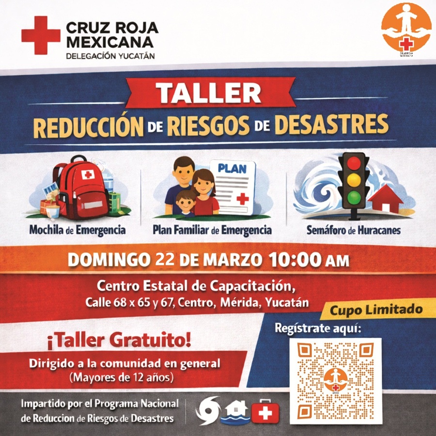 MÉRIDA, Yucatán, viernes 13/03/2026.- La Cruz Roja Mexicana Delegación Yucatán hace una atenta invitación para asistir al taller de Reducción de Riesgos de Desastres para capacitarse sobre el semáforo de huracanes, la mochila y el plan familiar de emergencia.
