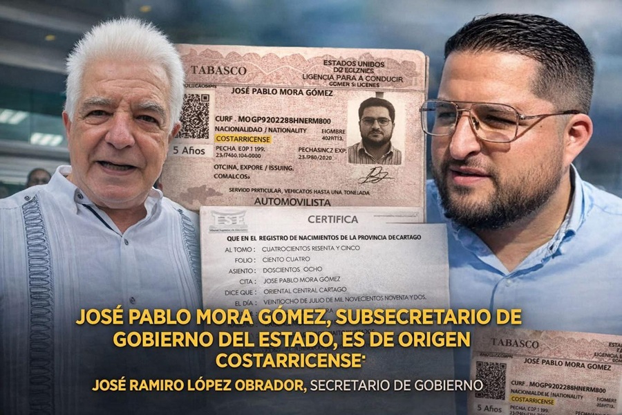VILLAHERMOSA, Tabasco, miércoles 18/03/2026.- Si Layda Sansores importó a Campeche y colocó en casi todos los cargos de su gobierno a michoacanos, chilangos y hasta austriacos, su homólogo de Tabasco, Javier May, también morenista, está igual o peor, pues colocó como subsecretario de Gobierno a un ¡costarricense! ¡Sí! un sujeto llamado José Pablo Mora Gómez, oriundo de Costa Rica. Como si entre los tabasqueños no hubiera gente preparada y capaz de ejercer esta función.