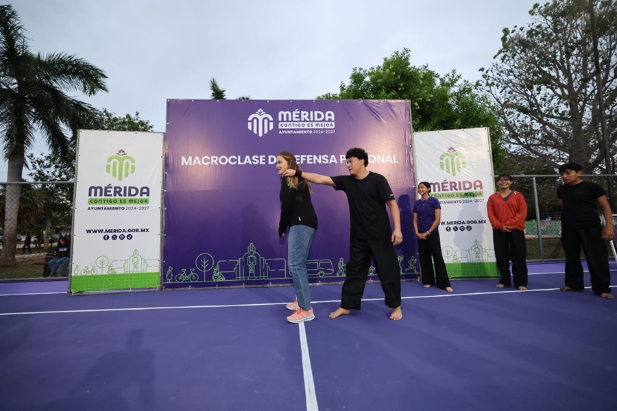 MÉRIDA, Yucatán, jueves 19/03/2026.- Como parte de las políticas públicas de cuidado y protección hacia las mujeres, la presidenta municipal de Mérida, Cecilia Patrón Laviada, encabezó una macroclase de defensa personal en la Cancha Violeta del Parque de Vista Alegre Norte.