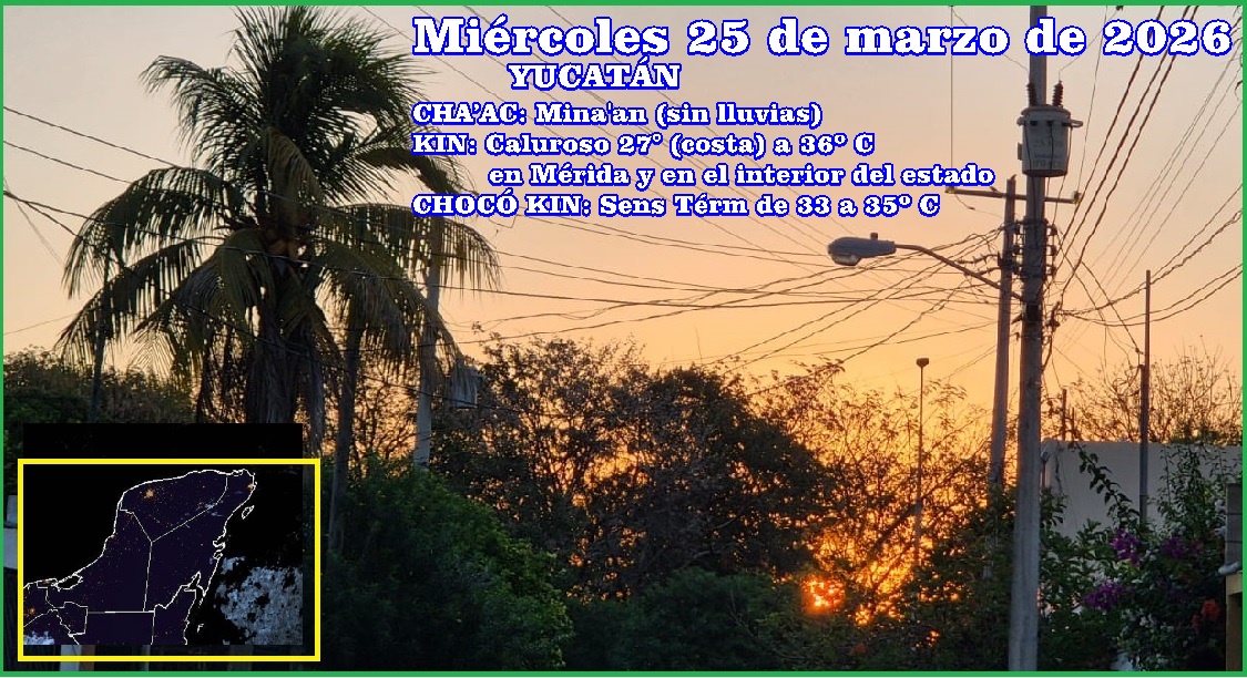 MÉRIDA, Yucatán, miércoles 25/03/26.- Luego de un amanecer de algo fresco a fresco hoy miércoles el Oriente y el Sur de Yucatán de nuevo serán los más calurosos de Yucatán, con hasta 36º C y sensación térmica de 35º y no se esperan lluvias en el estado.