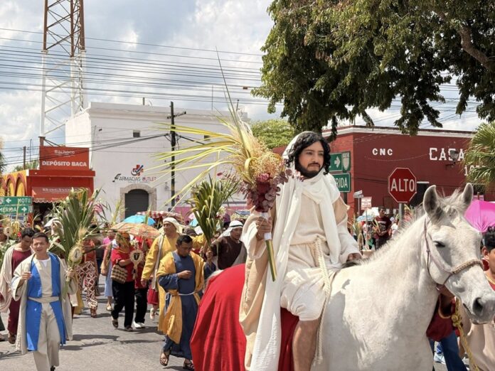 BACA, Yucatán, domingo 29/03/2026.- Partiendo de la comisaría de San Isidro Kuxub fue como Roman Cauich, quien representa el papel de Jesús este 2026, inició su recorrido de un kilómetro hasta la iglesia de la purísima concepción en Baca.
