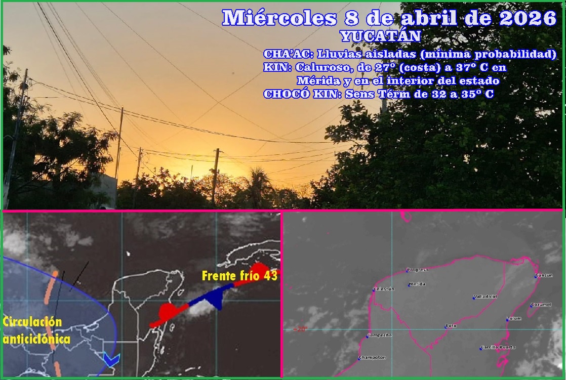 MÉRIDA, Yucatán, miércoles 08/04/26.- Debido a la cercanía del frente frío 43, estacionado en la costa noroeste y frente a las costas de Yucatán, luego de un amanecer fresco habrá calor de hasta 37º C, en el Oriente del estado, y bochorno de 35º C.