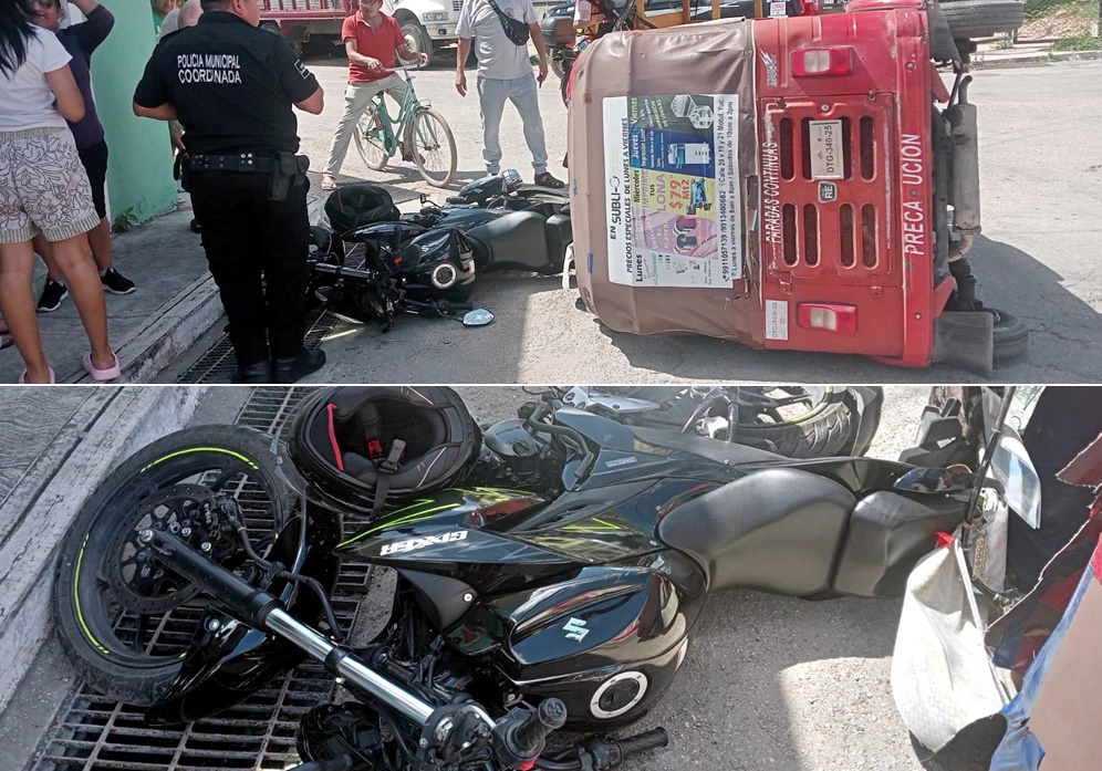 MOTUL, Yucatán, jueves 09/04/26.- Dos mujeres resultaron lesionadas, ayer miércoles en la tarde, porque la mototaxi en la que viajaban chocó contra un motociclista y volcó en el cruce de las calles 34 con 31, a la altura del tinaco del agua potable.