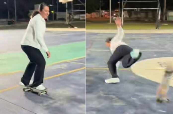UMÁN, Yucatán, domingo 12/04/2026.- Kenia Walldina (a) “Lucas Intenso”, dio un tumbo más en su nefasta administración en Umán, al intentar lucirse con una patineta frente a un grupo de skaters con los que se reunió la noche del sábado, pues a consecuencia de su nula habilidad, cayó como un saco de papas.