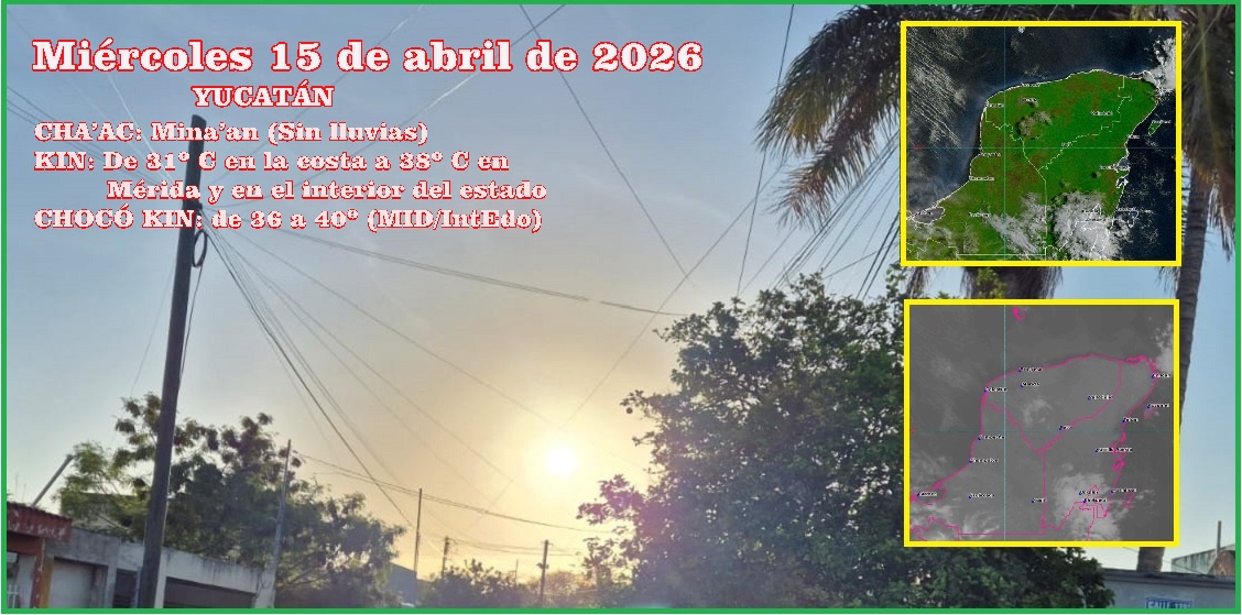 MÉRIDA, Yucatán, miércoles 15/04/26.- Luego de un amanecer agradable, hoy miércoles en Yucatán se espera una temperatura máxima de 36 a 38º C, en gran parte del estado, con una sensación térmica de hasta 40º (en el interior del estado) y no habrá lluvias.