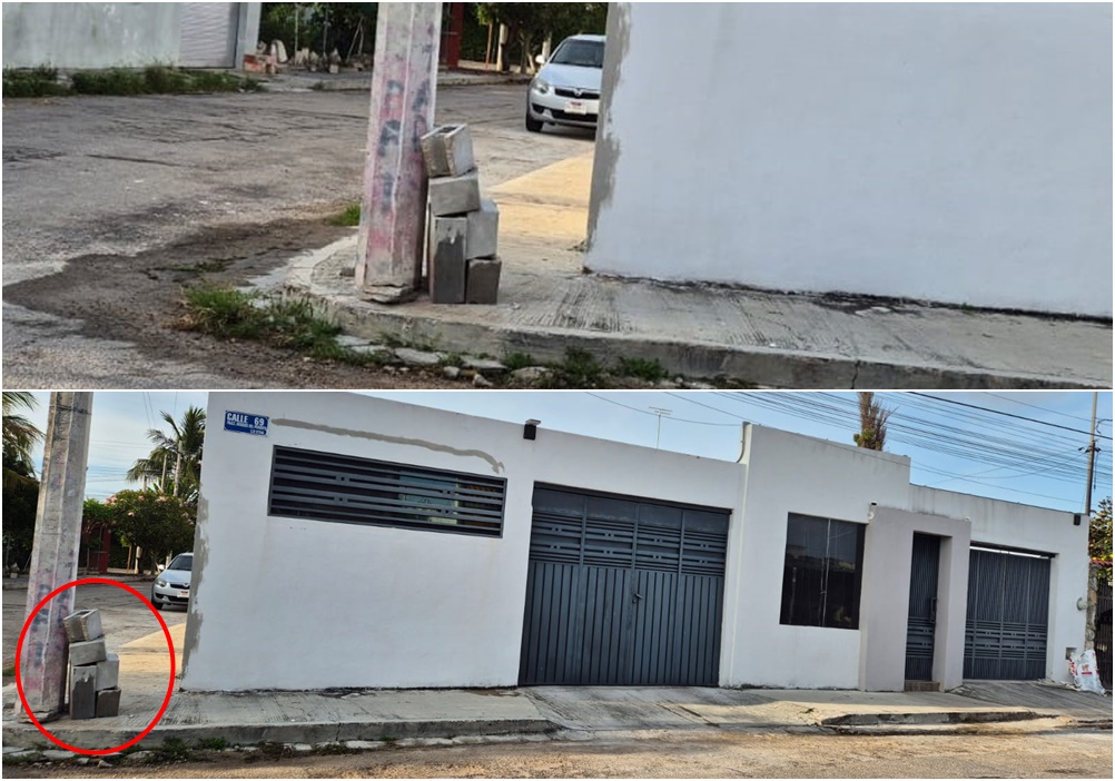 MÉRIDA, Yucatán, lunes 20/04/26.- Una vecina de la calle 69 con 128-B, del fraccionamiento Bosques del Poniente dejó en la esquina, junto a un poste de la CFE bloques y pedazos de bloques, que bloquean parte de la acera, denuncian vecinos.