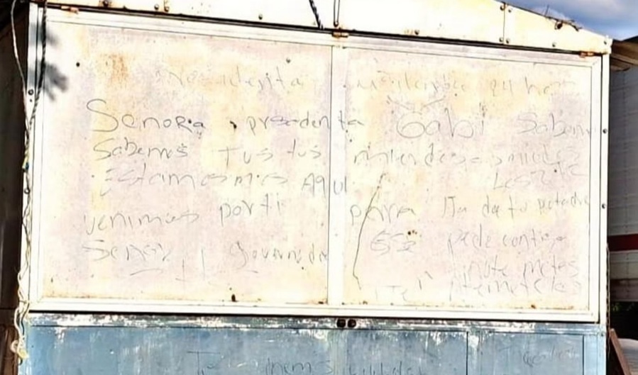 Señora presidenta Gabi, estamos aquí los zetas, venimos por ti, perra (insultos) y otras amenazas incluso de una advertencia de tiempo de 24 horas, es de lo poco que se alcanza a leer en el difuso mensaje.