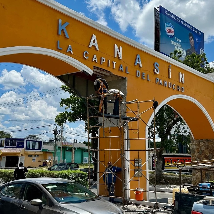 KANASÍN, Yucatán, martes 21/04/2026.- La administración municipal informó que ayer lunes comenzaron los trabajos de mantenimiento y reparación del arco de bienvenida a la ciudad, luego de que recientemente fue dañado por el paso de un tráiler.