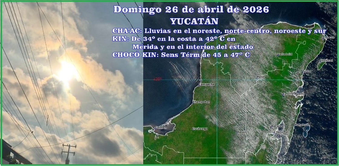 MÉRIDA, Yucatán, domingo 26/04/26.- Hoy será otro día muy caluroso, con temperaturas máximas de 40º C o más y una sensación térmica o bochorno de 47º o tal vez más, y hay esperanza de lluvias en el noreste, norte-centro, noroeste y sur del estado.
