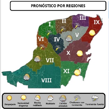YUCATÁN: Cielo de despejado a parcialmente nublado, habría lluvias en el noreste, norte-centro, noroeste y sur del estado, y el ambiente será de muy caluroso a extremadamente caluroso durante el día y cálido en la noche. Vientos del sureste, de 15 a 25 km/h y rachas mayores a 40 km/h, aunque en la tarde virarán al noreste, en el Norte del estado.