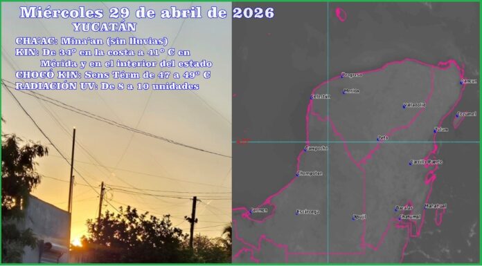 MÉRIDA, Yucatán miércoles 29/04/26.– Media semana con ambiente de muy caluroso a caluroso en extremo en el Oeste, Suroeste, Sur y Cono Sur del estado, con temperaturas máximas de 39 a 42º C y sensación térmica de 49º.